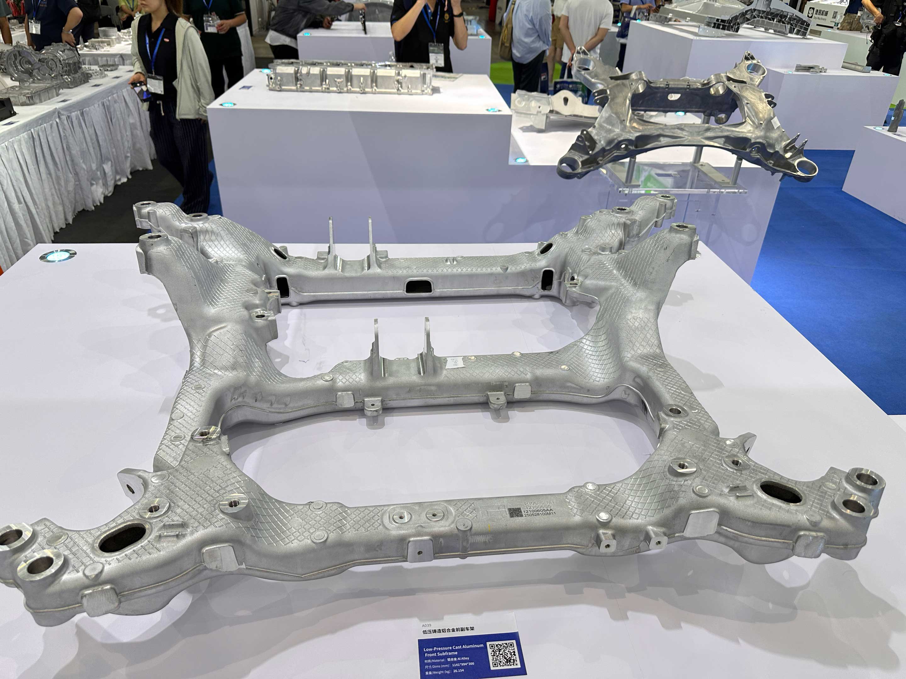 在本次展会上,奔达精心准备了丰富的展品,重点展示了公司在铝合金模具制作以及高压铸造领域的深厚积淀与创新能力:现场展出了应用于汽车核心结构件,如副车架、转向节、电机壳体、通讯设备、发动机支架等有代表性、复杂、高精度的样件,直观呈现了公司在应对薄壁化、高集成度、高品质要求方面的卓越设计能力和精湛制造工艺。同时,首次由奔达从模具设计、模具制造、试模交样的副车架样品也在本次展会上作为优秀铝合金铸件展示。