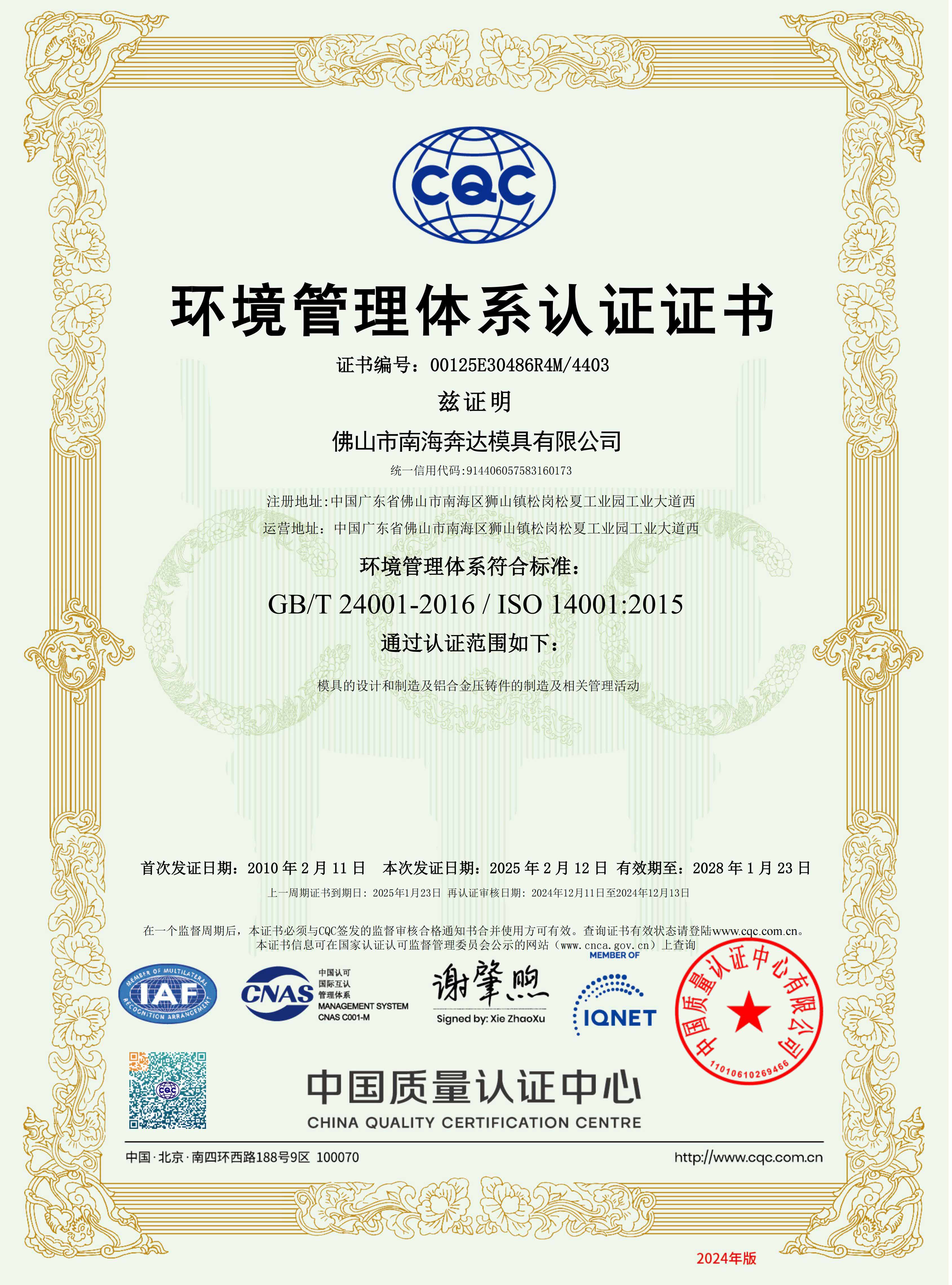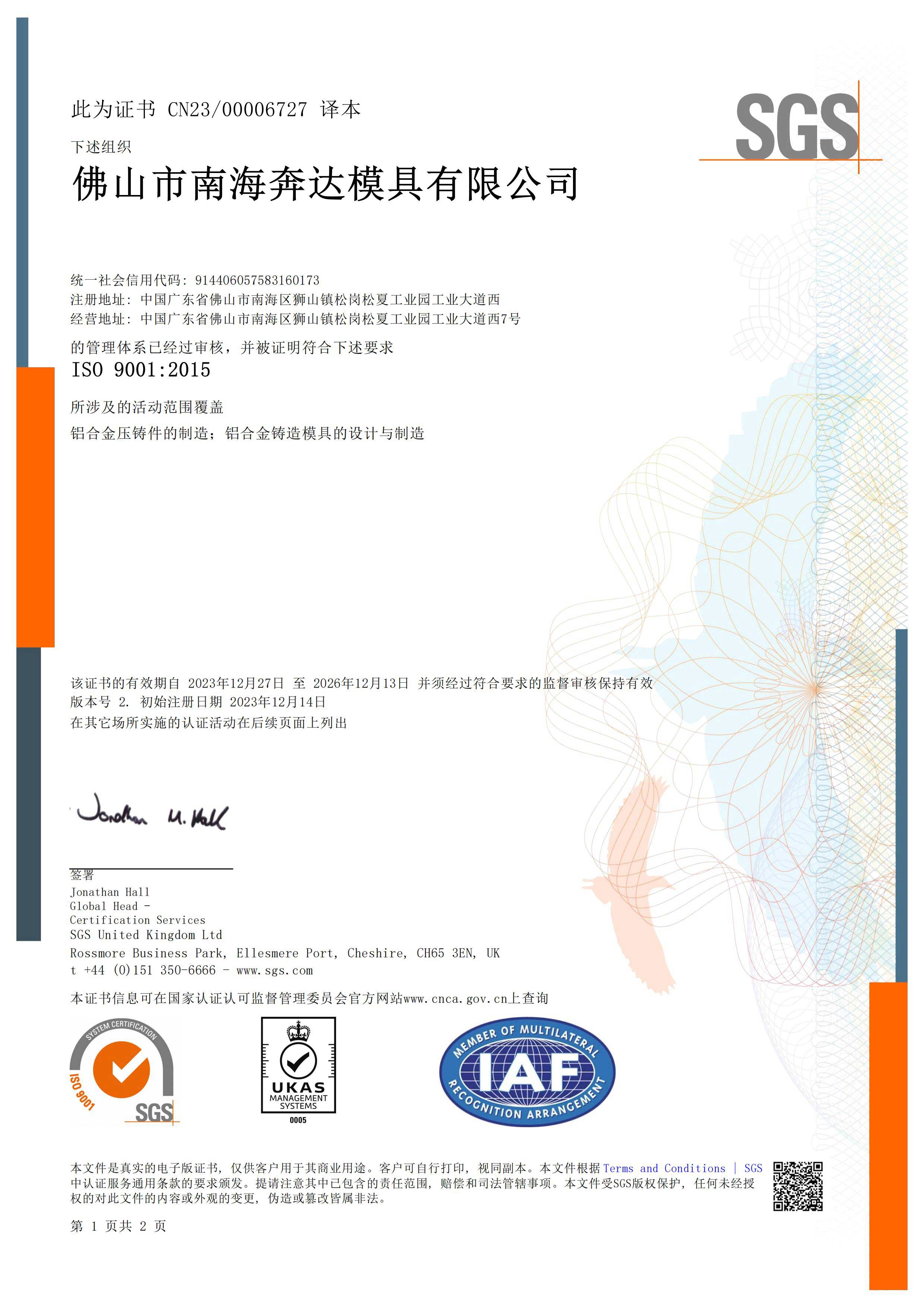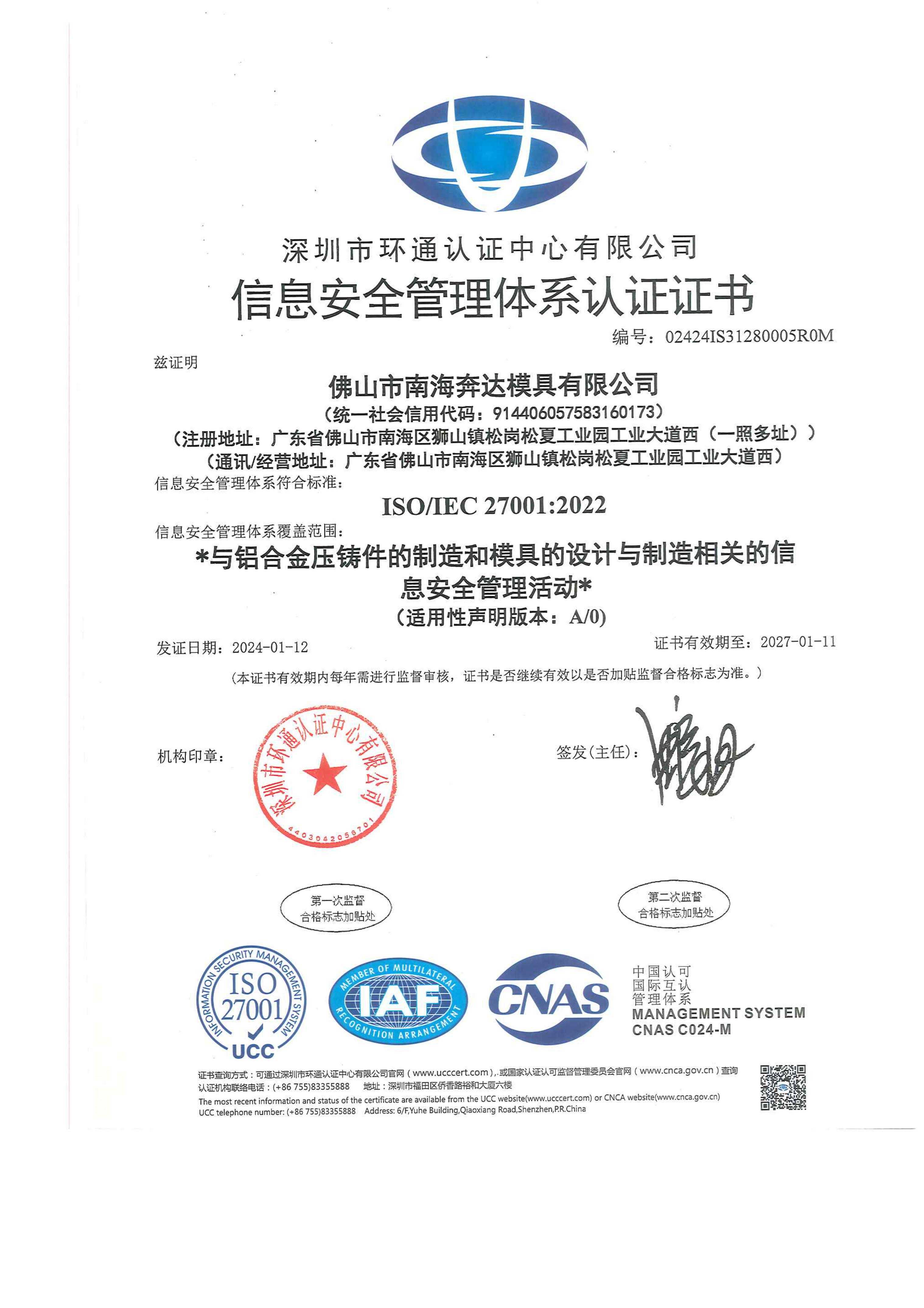 奔达以“严管理、重质量、高信誉、优服务”为质量方针,执行各项国际品质控制认证标准。公司拥有先进的检验测量设备,完善的质量管理体系,确保每一套模具和铝合金压铸产品的优异品质。奔达致力于打造以全流程(包括设计、制造、试制、售后服务)零缺陷为管理目标的品管体系,持续稳定地输出高品质无缺陷的产品、服务。奔达以优质的产品及服务长期作为福特、丰田、中信戴卡、立中集团、DEE ZEE等国内外客户的合格供应商。