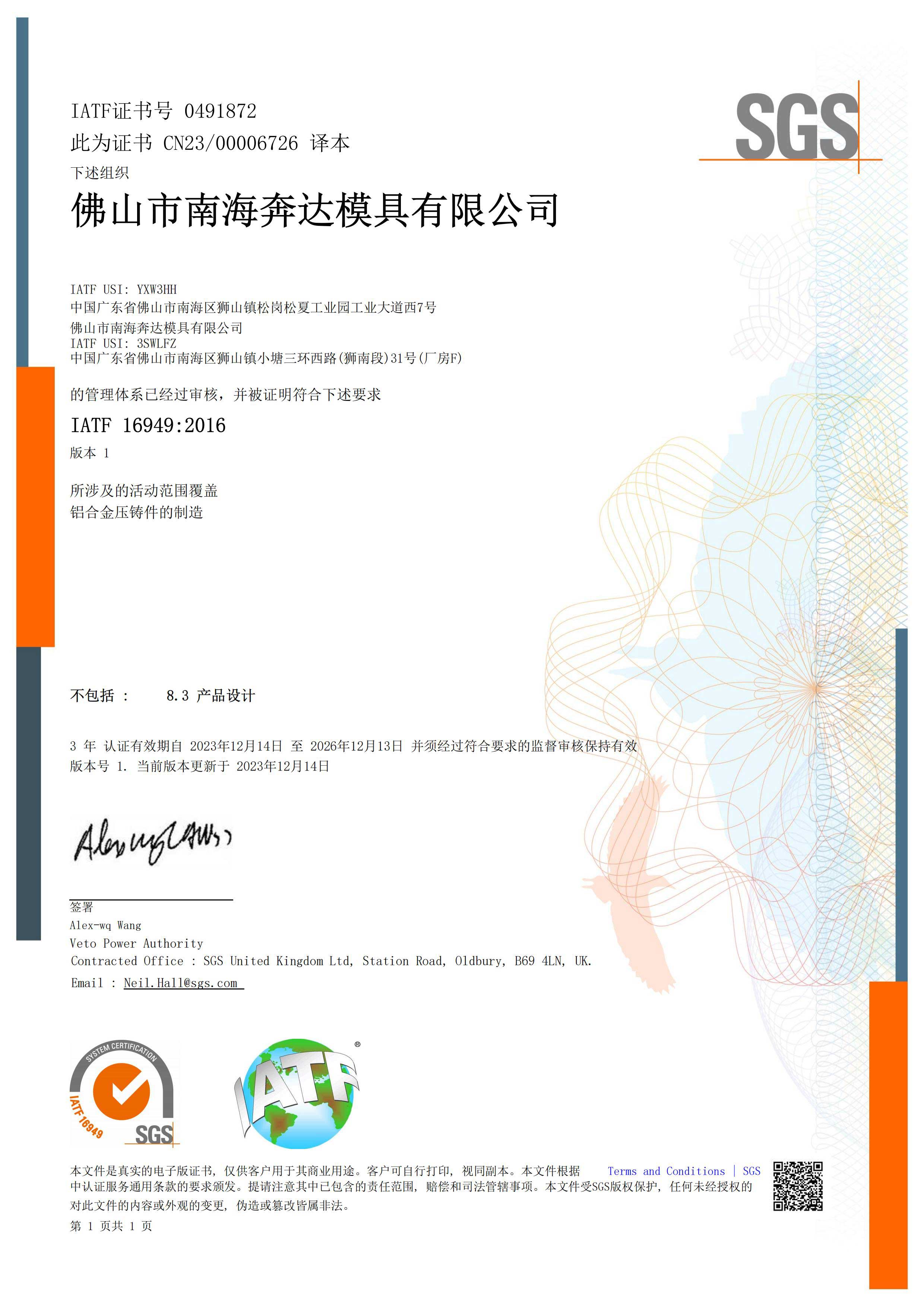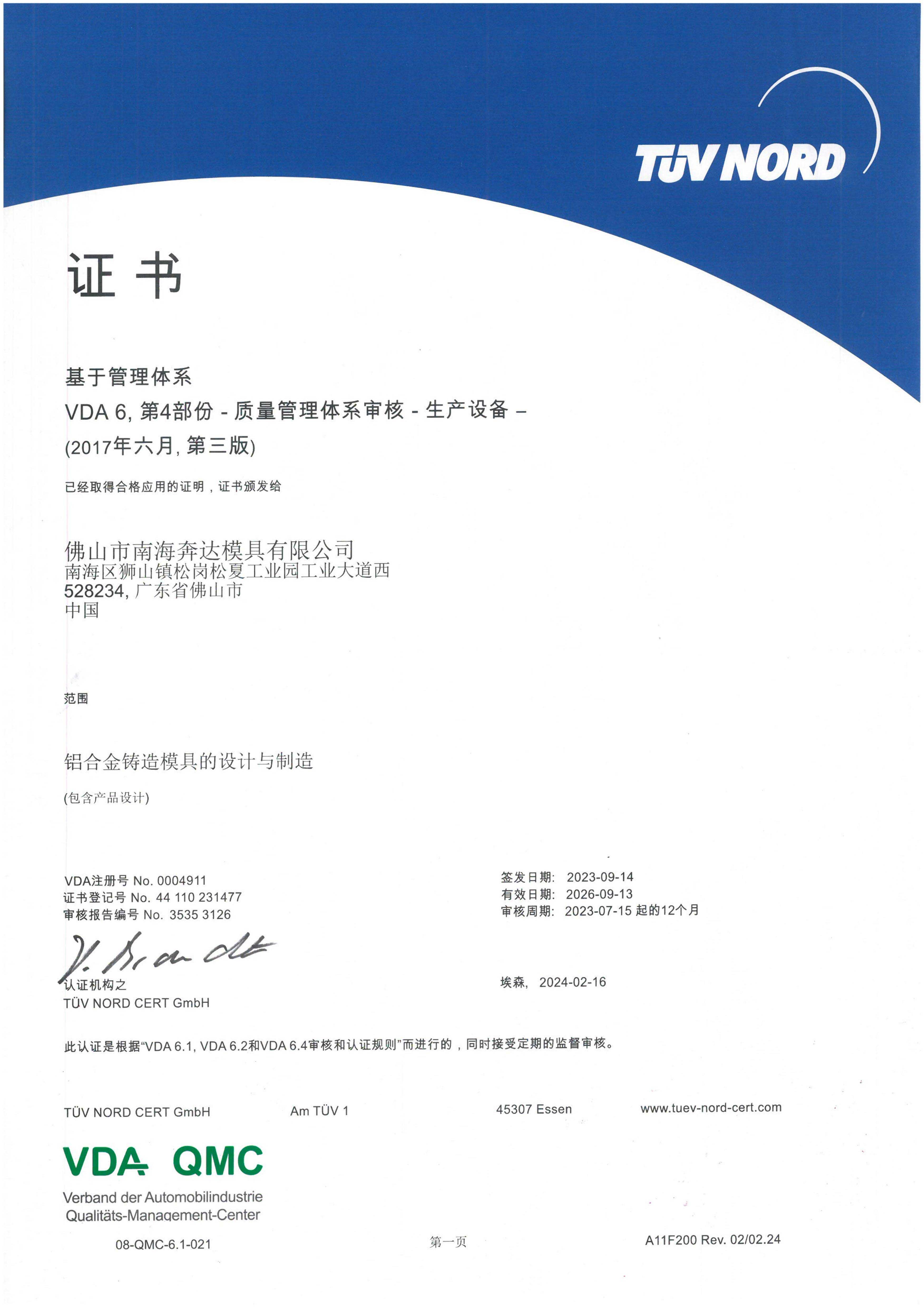 奔达1998年获得ISO9001认证;2008年获得ISO/TS16949认证;2010年通过ISO14001环境管理体系认证;2020年通过VDA6.4质量管理体系认证。